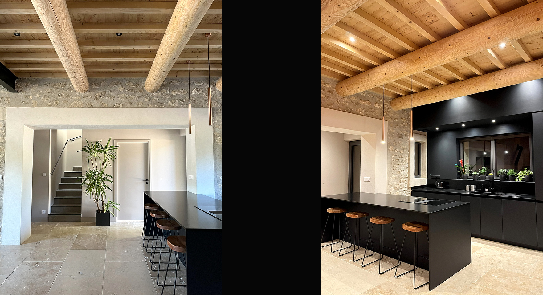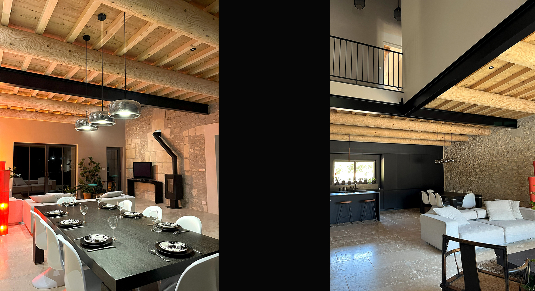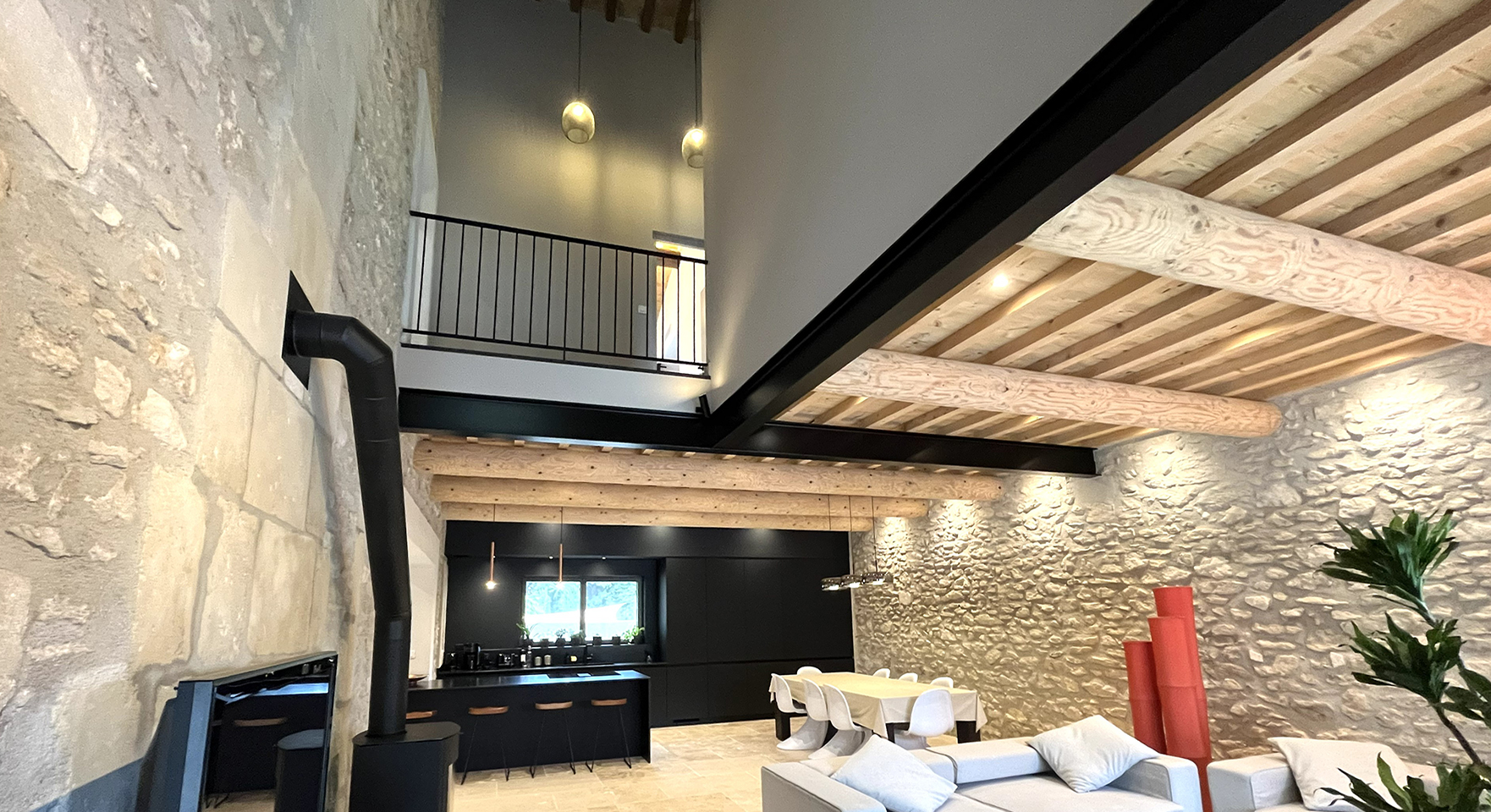 La pierre sera apparente sur les autres murs intérieurs par souci esthétique. Les planchers et charpentes en bois seront apparents et mis en valeurs grâce à l’éclairage. Une partie du rez de chaussée sera à double hauteur et une balconnade qui donne sur le salon sera créée au R+1
